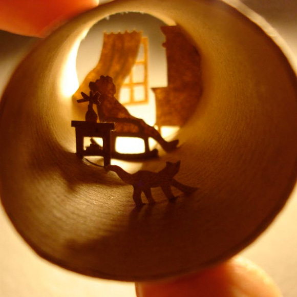 Anastassia Elias ha llegado en el día de hoy a nuestro blog para alegrarlo. ¿Cómo? Con sus bellas obras de arte. Algo muy simple, delicado y donde reinará la imaginación. De una manera muy inteligente y creativa, Anastassia ha sabido meter una escena de película en un rollo de papel higiénico.